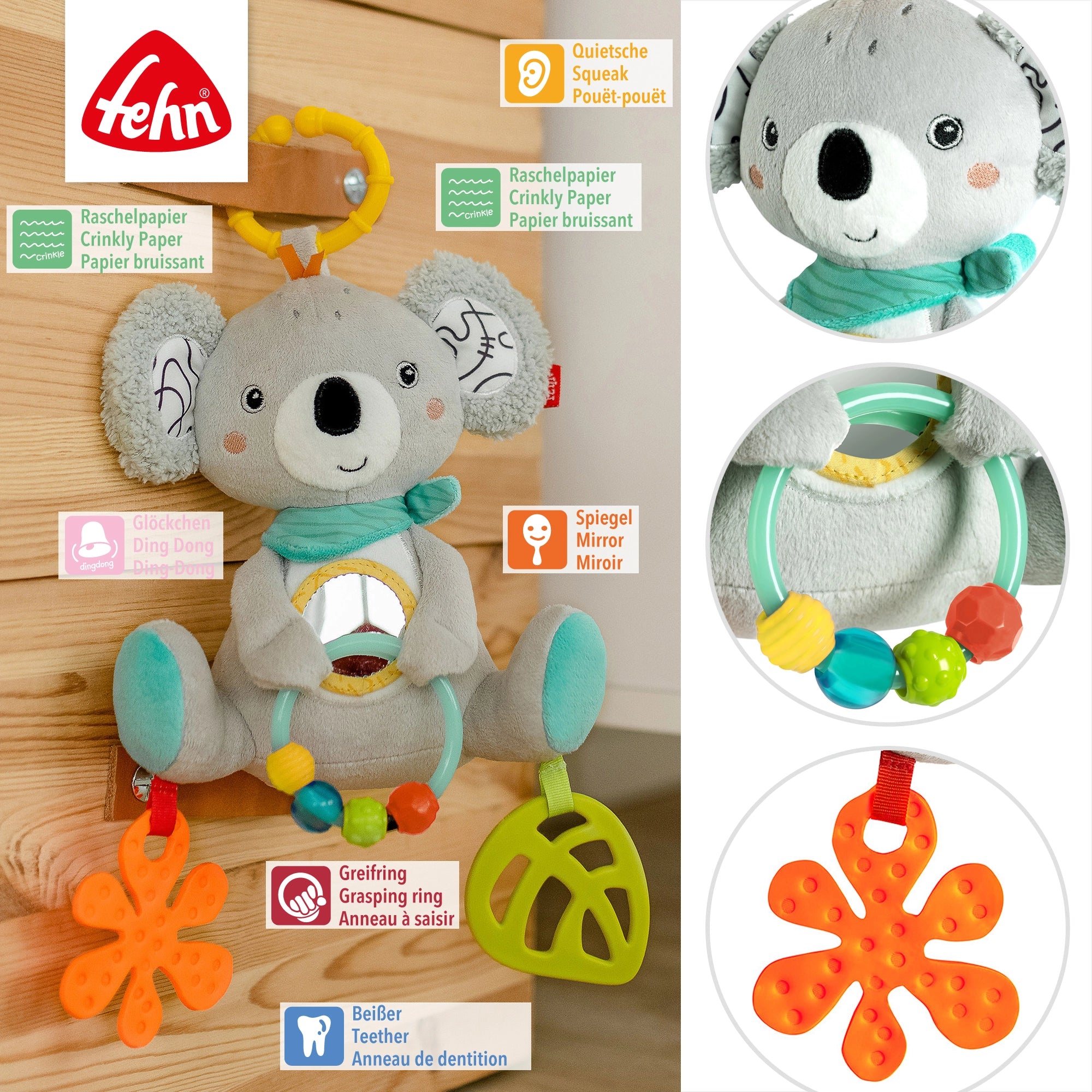Fun at home & on the go: The colourful activity koala from the DoBabyDoo collection is flexibly attached to a stroller with the practical C-ring. The exciting game functions of the colorful toy animal keep bany in a good mood everywhere: bells, squeaks & rustling paper inspire babies to discover and curiosity and promote their senses and motor skills. The pearl ring with colorful pearls and the exciting mix of soft velour, printed fabric, bouclette invite bany to grab, play and feel. A mirror playfully trains self-perception.