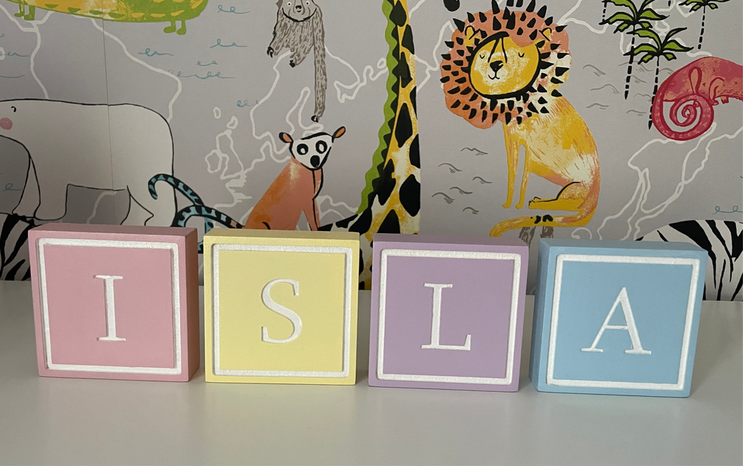 A colourful addition to your little ones room or nursery. Freestanding name blocks available in several colours. One letter per block (uppercase)