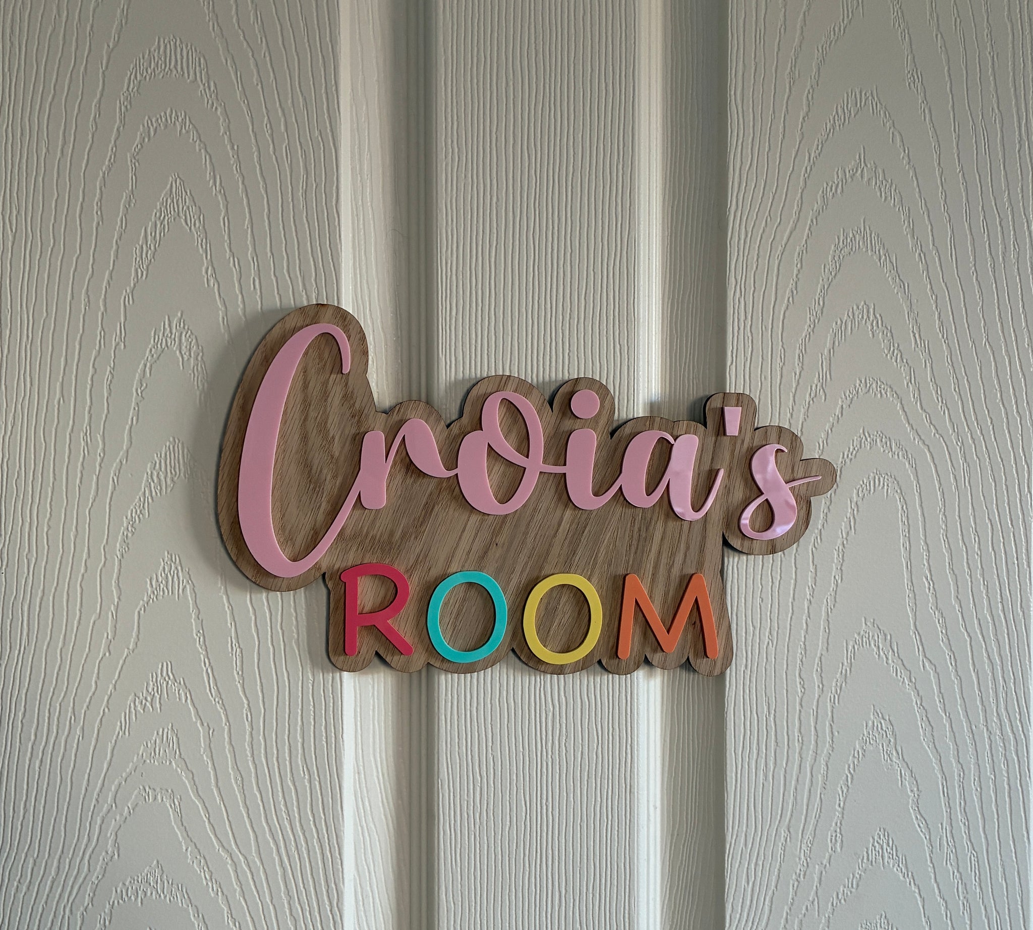 Add a personalised touch to your children’s space with our beautifully crafted oak sign with acrylic lettering. Perfect for any room or door.